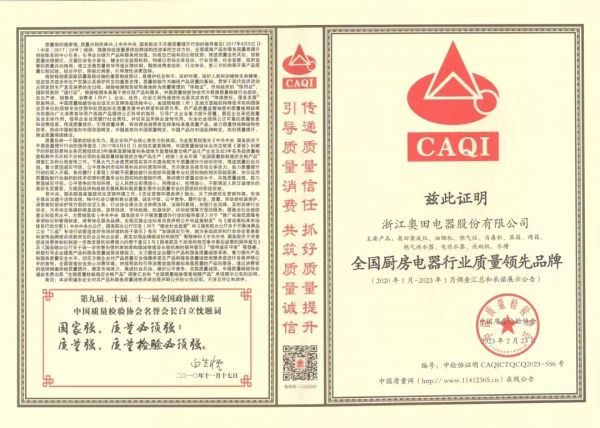 奥田集成灶作为第一批浙江制造“品”字标杆企业,在产品的创新研发上不断精益求精,高度把控质量安全关卡,荣获浙江燃气具和厨具厨电行业协会、浙江省厨具标准化技术委员会颁发的《标准编写证书》,表彰企业为T/ZRC04-2018《集成灶》团体标准起草单位,累计荣获近百项专利证书,不断提升品牌的综合实力。