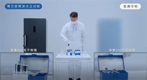 视频中,试验人员将两张同样的湿纸巾借助玻璃杯卷成纸筒后,分别放在海尔变频深冷立式柜和普通冷柜中。设置-40℃下急冻半小时后,试验人员拿出纸筒,分别盖上亚克力板,同时往上放砝码,经海尔变频深冷立式柜急冻的纸筒,承重900g依然坚挺,经普通冷柜急冻的纸筒,承重200g即倒塌。