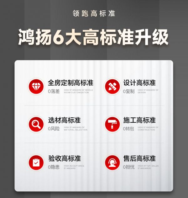 从2022年率先行业提出“全房定制、设计、选材、施工、验收、售后”六大高标准,领航高品质家装市场,到2023开年率先完成六大高标准升级,持续领跑行业,再到“领跑高标准 十年如新”战略发布。鸿扬的每一个战略举措,走得既稳又新,为行业标准的建立与提高提供有力的支撑,彰显了龙头企业的领导力。