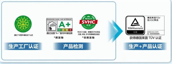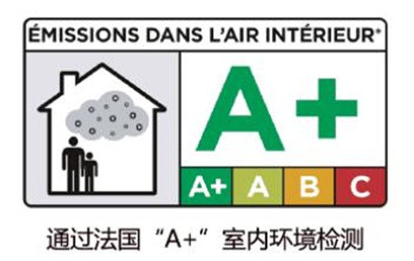 评级空气中总挥发性有机化合物、十种常见的对人体有危害的有机化合物浓度,达到法国的最高环保级别“A+”。