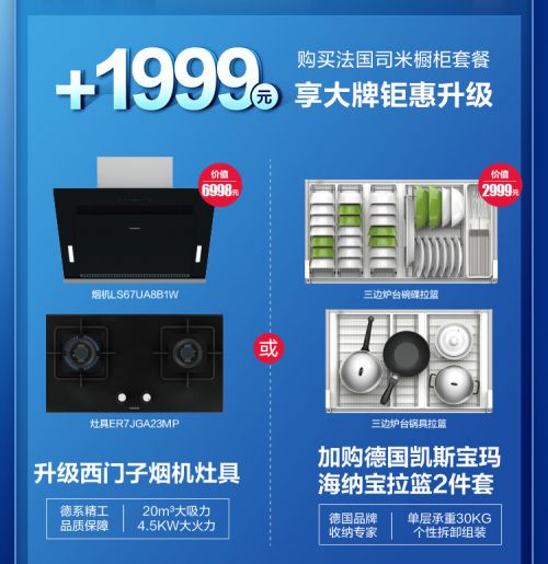 同时凡选购法国司米高端亲肤PET/吸塑橱柜套餐,加购1999元即享大牌钜惠升级!可升级价值6998元的西门子烟机灶具,德系精工品质保障!亦可选择加购价值2999元的的德国品牌收纳专家凯斯宝玛的海纳宝两件套,让厨具整齐收纳!欲购从速,火爆搭配装备齐全!