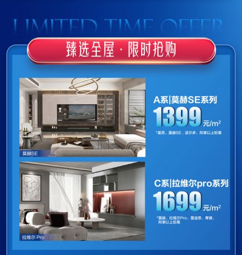 全屋产品C系拉维尔PRO系列,限时抢购盛惠价1699元/㎡,选用了法国司米全新升级的静电喷粉烤漆工艺,展现出既极简低奢又具备高环保、高性能、高颜值与高品质的美学家居空间,引领环保家居新生活!