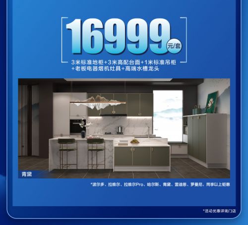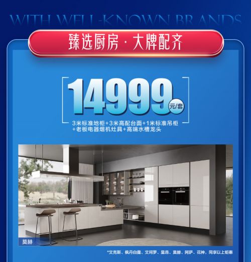 凡购买法国司米以上任一款甄选厨房套餐,均配套3米标准地柜+3米高配台面+1米标准吊柜,再配齐老板电器烟机灶具与高端水槽龙头!