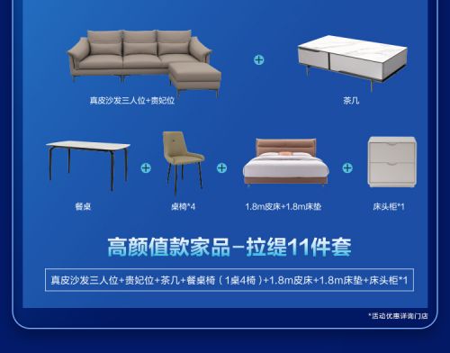 整家高颜家品更可一步到位,法国司米全方位满足您的高端整家家装需求!凡选购法国司米高端奢颜臻品整家套餐,还包含1樘精致木门及高颜家品拉提11件套(真皮沙发三人位+贵妃位+茶几+餐桌椅(1桌4椅)+1.8m皮床+1.8m床垫+床头柜*1)。