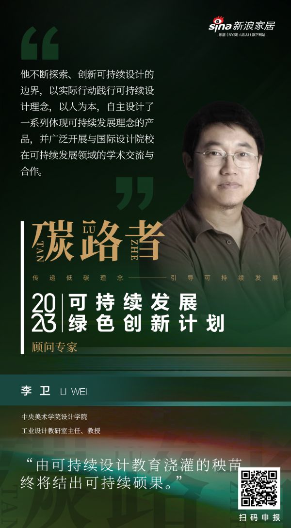 为此,新浪家居特别邀请中央美术学院设计学院工业设计教研室主任、教授 李卫老师作为项目顾问专家,线上出席了“碳路者 2023可持续发展绿色创新计划”启动仪式,针对可持续发展提出建言。