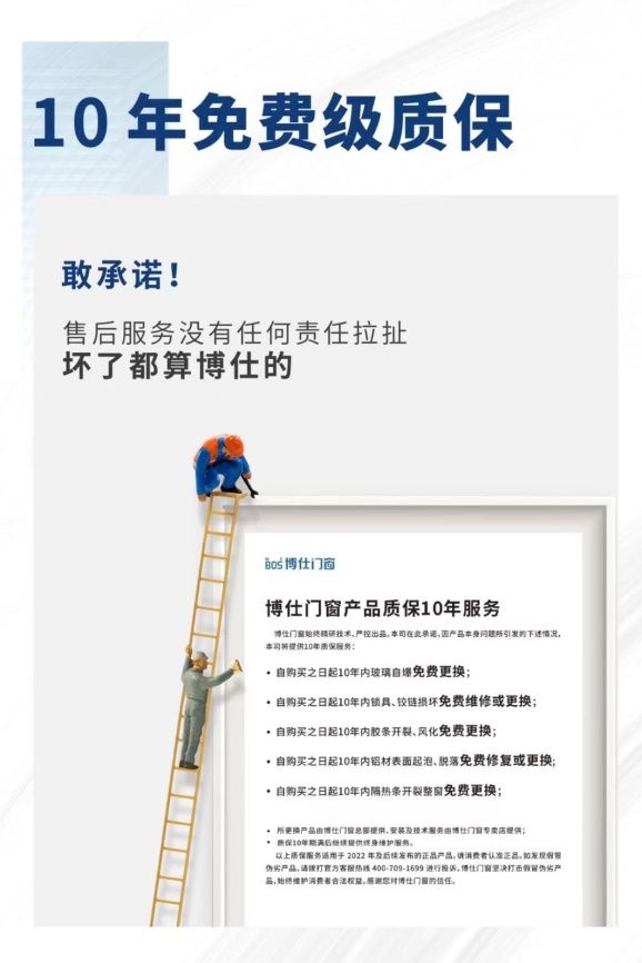 10年免费级质保。博仕门窗给消费者承诺10年免费级质保服务,十年内产品出现任何问题,品牌都将免费为消费者更换,为消费者打造“更放心、更安心”的使用体验。十年免费质保服务,不仅仅是承诺,更是企业产品质量的展示,产品品质必定坚实可靠,才能有如此的承诺。
