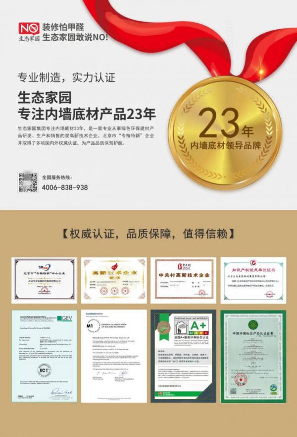 生态家园23年来只做两件事致力于内墙产品和施工安全无隐患,遵循“装修怕甲醛,生态家园敢说NO!”的承诺,在产品绿色环保的道路上扎实前行,在先后获得德国GEV-EC1 plus、芬兰M1等世界严苛的环保认证之后,再获德国AgBB及比利时VOC两大环保认证,为产品的环保性保驾护航,让生态家园业主的家与环保触手可及,共同实现绿色环保家居梦想!