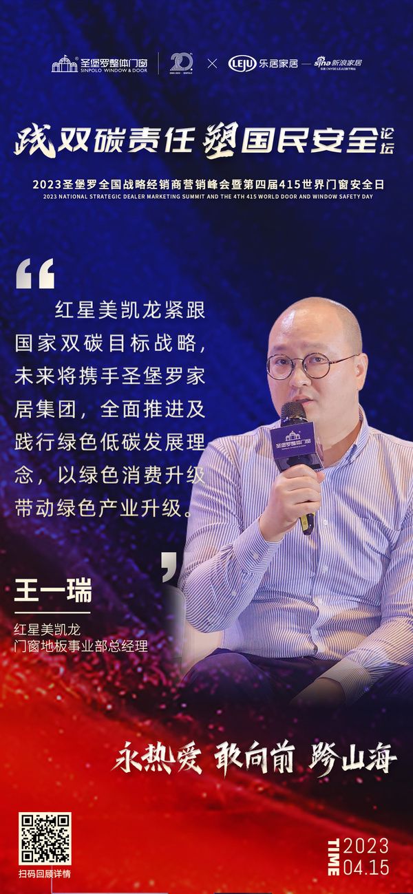 红星美凯龙门窗地板事业部总经理王一瑞:红星美凯龙紧跟国家双碳目标战略,未来将携手圣堡罗家居集团,全面推进及践行绿色低碳发展理念,以绿色消费升级带动绿色产业升级。