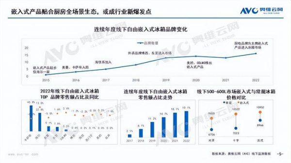 在家电市场呈缓降趋势中,保持逆势走高的嵌入式冰箱就是个鲜明的例子。在奥维云网数据中显示,2022 年的双十一嵌入式冰箱零售规模同比大增 64.9%,远超冰箱整体市场 8.9% 的增幅。《2022 中国高端家电市场报告》也显示,2022 年以来," 超薄冰箱 " 在多门对开门冰箱市场的零售额占比达到 59.1%。