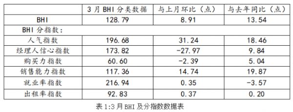 全国建材家居景气指数BHI 3月份为128.79,环比上涨8.91点,同比上涨13.54点。全国规模以上建材家居卖场3月销售额为1292.73亿元,环比上涨14.37%,同比上涨20.39%;1-3月累计销售额为3206.95亿元,同比上涨10.30%。