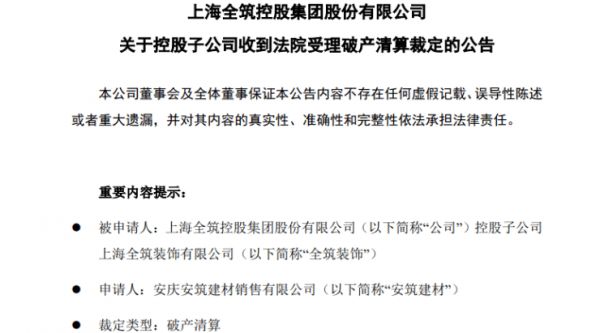 4月12日,全筑股份(603030.SH)公告称,公司控股子公司全筑装饰近日收到上海市第三中级人民法院 的《民事裁定书》(【2023】沪03破203号),裁定受理安筑建材对全筑装饰的破产清算申请。全筑装饰进入破产程序后,由法院指定管理人接管,其不再纳入公司合并报表范围,该事项预计将导致公司的资产及收入规模大幅下降。另外,全筑股份终止出售持有的全筑装饰的81.50%股权。
