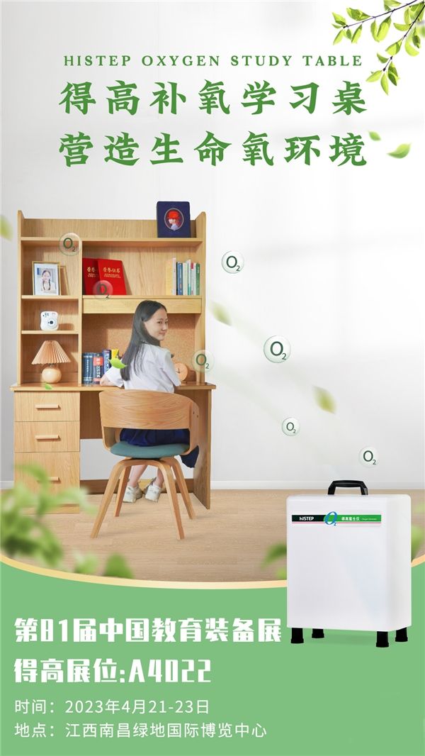 科技富氧赋能智慧大脑,助力中华少年成长成才。得高补氧学习桌即将亮相中国教育装备领域规模最大、品类最全的专业性品牌展会——第81届中国教育装备展示会,大会将于4月21日-23日在南昌举办,会全方位展示教育行业所需的装备、软件、产品和服务。得高作为行业的创新者,创新性地实现富氧科技与教育应用的深度融合,将为中国教育装备展带来新能量。