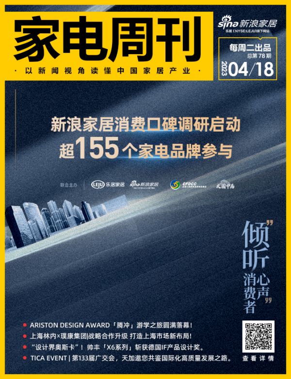 新浪家居 | 2023中国家居消费者口碑调研启动 超155个家电品牌参与;俯察西南世界璀璨设计,Ariston Design Award「腾冲」游学之旅圆满落幕!;TICA Event | 第133届广交会,天加邀您共鉴国际化高质量发展之路;“设计界奥斯卡”!帅丰「X6系列」斩获德国IF产品设计奖;上海林内x璞康集团|战略合作升级 打造上海市场新布局......一周精彩新闻全在新浪家居家电周刊,不容错过。