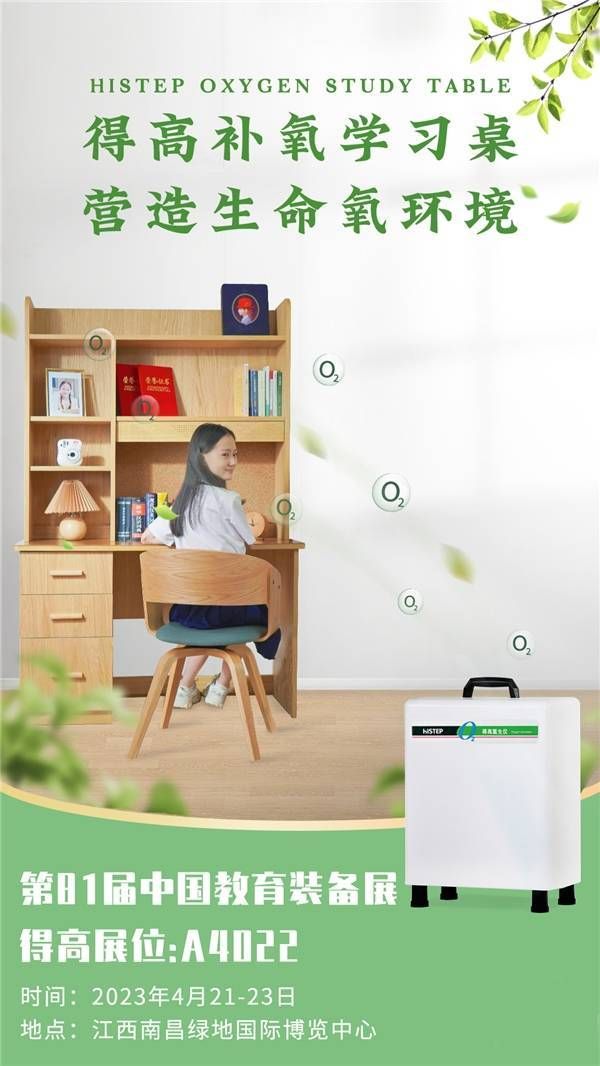 科技富氧赋能智慧大脑,助力中华少年成长成才。得高补氧学习桌即将亮相中国教育装备领域规模最大、品类最全的专业性品牌展会——第81届中国教育装备展示会,大会将于4月21日-23日在南昌举办,会全方位展示教育行业所需的装备、软件、产品和服务。得高作为行业的创新者,创新性地实现富氧科技与教育应用的深度融合,将为中国教育装备展带来新能量。