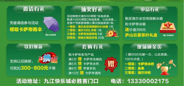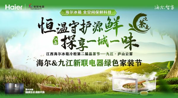 “恒温守护源鲜 探享一城一味”江西海尔冰箱冷柜第二届品茶节九江庐山云雾,暨海尔&九江新联电器绿色家装节4月21日将于九江市喜盈门建材家居广场隆重举行。 活动现场将进行茶文化节目演绎,炒茶展演、品茶、斗茶(邀约庐山云雾茶专家及茶楼、茶馆、茶叶爱好者、市民参与的方式)、现场抽奖、参观等 多彩茶文化互动。买天下茶,卖天下茶。九江茶卖全国,全国茶九江卖……用一杯茶温暖一座城,用一杯茶健康一座城。