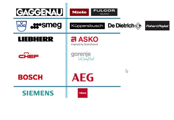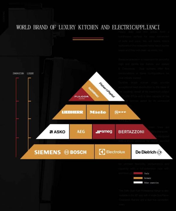 按奢侈度和创新性进行的排行,先来说最下面这排的入门级,SIEMENS西门子、BOSCH博世、Electrolux伊莱克斯、De Dietrich德地氏。西门子和博世是德国的,算是最早一批进入中国的国外品牌。其实它们都不算厨电行业,产品种类繁多,大家电里的啥都有。现在这两个品牌都隶属于博西集团(包括嘉格纳品牌,也属于博西集团),国内市场销售的产品主要是国内制造,加部分代工,也主要在国内销售。从其市场定位来讲也是介于海尔卡萨帝与高端之间的产品,勉强算是入门级。