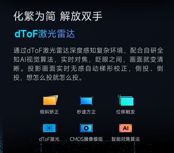 当贝D5X Pro采用当贝自研全知AI视觉算法,达到“越用越好用”的效果,并搭载dToF激光雷达,可以通过dToF激光雷达深度感知复杂环境,轻松做到自动入幕、自动避障、实时对焦、自动校正,无论如何侧投、倒投都能做到眨眼之间,画面清晰可见。