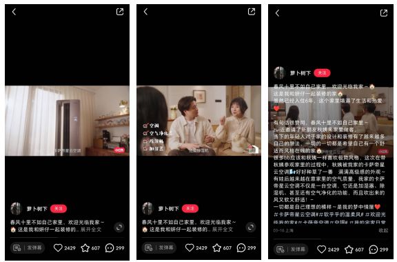而作为@萝卜树下 视频的共创者,@秋姨ChiilCool 视角则更全面直接地剖析了卡萨帝星云空调的优点——复合软风,又软又健康。作为一个健康自律的健身博主秋姨对空气质量有着高标准高要求,视频为做客@萝卜树下 家的后续,也更具有真实性。视频中着重强调了卡萨帝空调是集空调、加湿器、净化器、除湿机、消毒机、除甲醛机于一体的全能型智能产品,从实用功能角度切入完成产品种草。