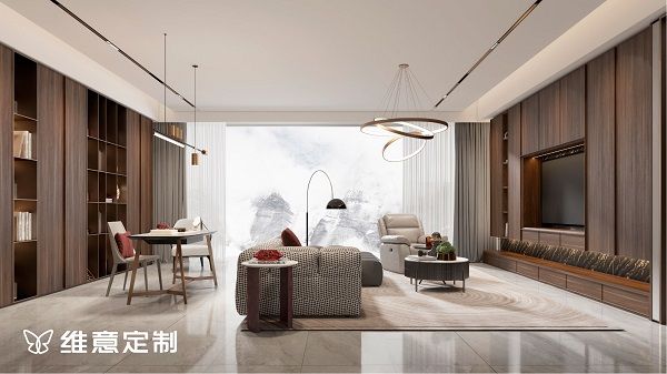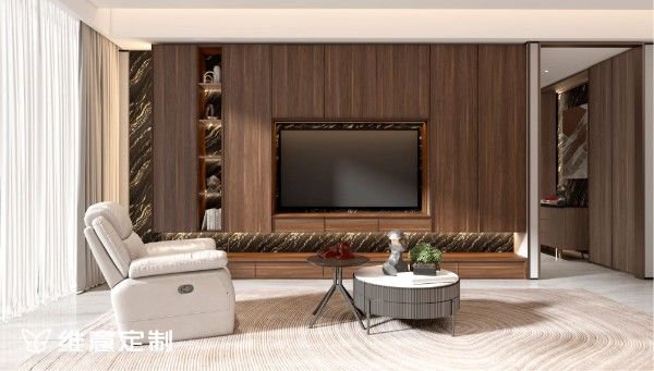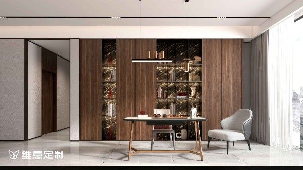 巧克力胡桃木搭配奢雅皮纹,空间柔软而优雅,休闲椅渲染出低调的阅读氛围,提升整个空间格调。