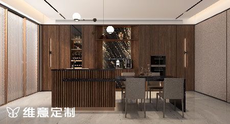 岛台餐桌一体定制,促进家人交流、陪伴与互动,玄武岩的原始肌理,与胡桃木的温润相得益彰。餐边柜美观实用,满足藏酒、烘焙、小家电储纳,收纳设计线条简洁明朗,呈现出生活的品质感。