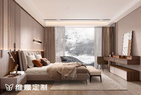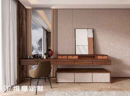 床尾的悬浮梳妆台与全身镜、背景墙融为一体,新颖别致,带来轻盈、通透的视觉美感。
