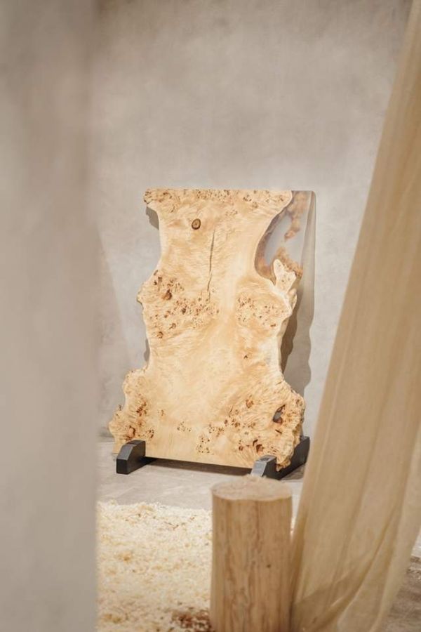 从切割、干燥、晾晒、加压等对原始木材的处理,到对天然木材的纹理与疤结部分的特别加工、涂装,梵几将其制成能用于多个生活场景的一枚板,不仅真实地传达出山野间传递而来的原始生态,更使其成为日常生活中的长久陪伴。