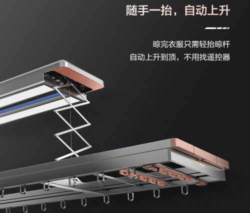 首先这款智能晾衣机,它所带来的是全功能性的产品,市面上记者所见到的大多数智能晾衣机,所携带的功能,在这款机器上都能找到。例如防太阳光紫外线杀菌、消毒、送风烘干系列、自由调节亮度、语音控制系统等等。在这么多功能的加持下,这款亚运星耀系列还保证了高颜值,超薄8厘米级潜隐收拢,就像是贴在墙顶上。下边的柜子门窗,可以无障碍开启关闭,没有任何阻挡。在超薄方面可以说做到了极致。7.5m/s三维双送风系统,烘干和风干两种模式,三个档位自由调节,无论何时,都可以对衣物进行干衣操作,即便是梅雨天气,在大功率双核风机的作用下,异物可以快速被吹干,并且机器无噪音。