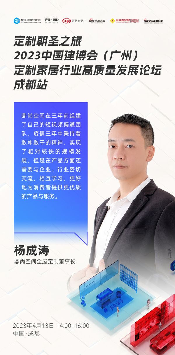 鼎尚空间全屋定制董事长杨成涛:鼎尚空间在三年前组建了自己的短视频渠道团队,疫情三年中秉持着敢冲敢干的精神,实现了相对较快的规模发展,但是在产品方面还需要与企业、行业密切交流,相互学习,更好地为消费者提供更优质的产品与服务。