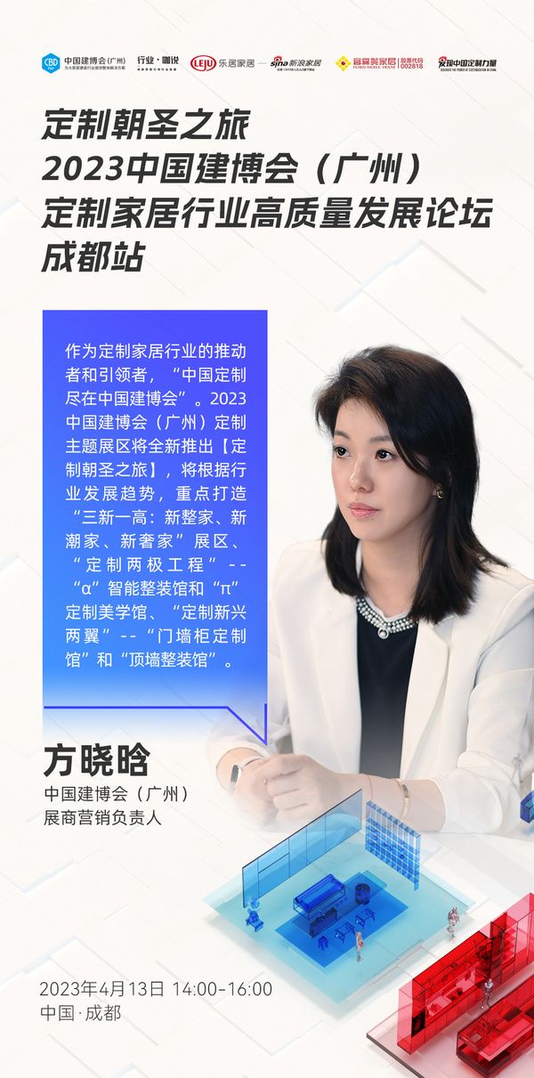中国建博会(广州)展商营销负责人方晓晗:作为定制家居行业的推动者和引领者,“中国定制尽在中国建博会”。2023中国建博会(广州)定制主题展区将全新推出【定制朝圣之旅】,将根据行业发展趋势,重点打造“三新一高:新整家、新潮家、新奢家”展区、“定制两极工程”--“α”智能整装馆和“π”定制美学馆、“定制新兴两翼”--“门墙柜定制馆”和“顶墙整装馆”。