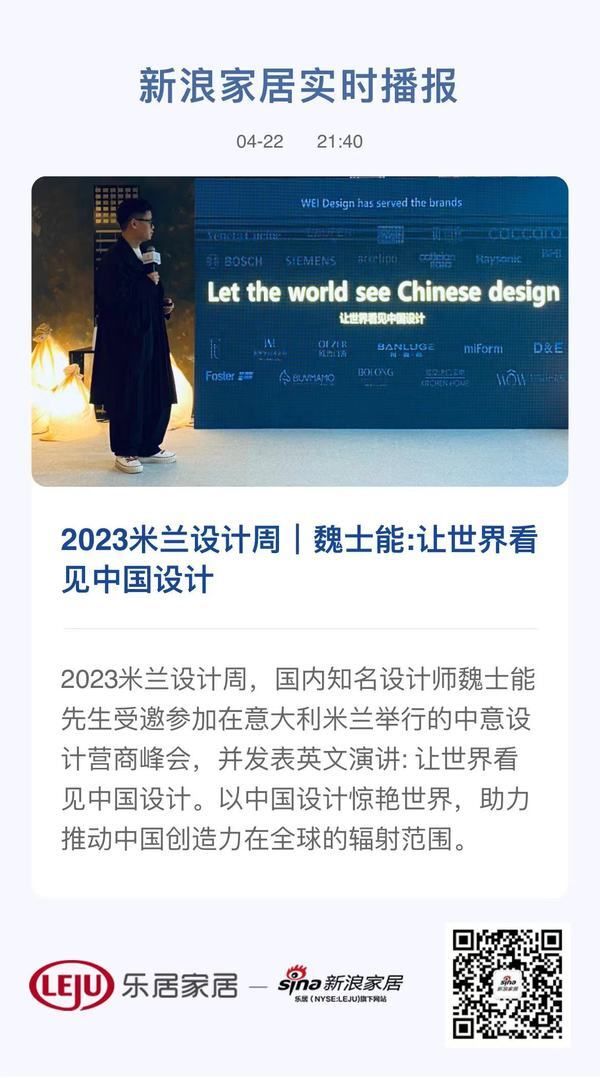 新浪家居讯2023米兰设计周,国内知名设计师魏士能先生受邀参加在意大利米兰举行的中意设计营商峰会,并发表英文演讲: 让世界看见中国设计。以中国设计惊艳世界,助力推动中国创造力在全球的辐射范围。