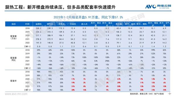 2023一季度,房地产虽然定调为“积极复苏”,但是全国房地产开发投资增速复苏的强度和力度却不够。据奥维云网(AVC)地产大数据显示,2023年1-2月精装房开盘5.91万套,同比下滑57.3%,其中烟、灶配套量均为5.8万套,同比均下滑56%;另一方面,消费者在耐用品上的消费意愿更加谨慎,这对于较强安装属性的油烟机和集成灶来说,都是一种挑战。