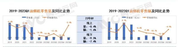 在面临着同样市场走势的大背景下,油烟机和集成灶的互为替代品的竞争关系在不断变化。据奥维云网(AVC)数据显示,2023年一季度油烟机市场零售额规模60亿元,同比下滑4.9%;集成灶市场零售额规模48亿元,同比增长0.5%。
