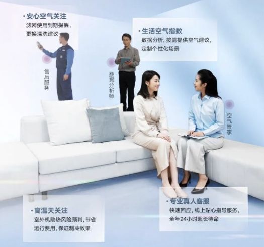 大金拥有自建的专业客服团队,全年24小时以真人专业客服与用户进行交互,能更加及时有效地提供服务保障。此外,新追加三大贴心服务项目,“安心空气关注”服务,可对滤网使用到期进行提醒,并给出更换清洗建议;“生活空气指数”服务,根据大数据分析,按需提供空气建议,定制用户专属个性化场景;“高温天气关注”模式,根据室外机散热风险进行自动预判,保障制冷效果同时更加节能。