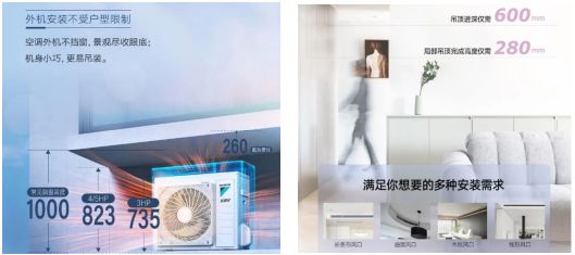 室外机机身更加小巧,更易吊装,更能满足低矮飘窗的户型设计,外机安装不受户型限制,确保空调外机不挡窗。