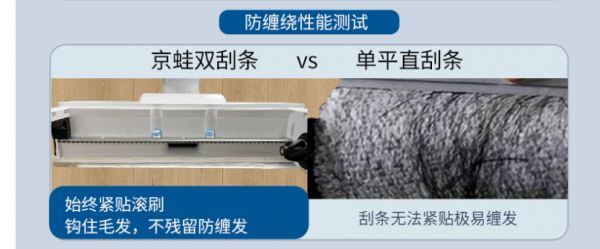 而京蛙洁净感无线智能洗地机XQ02Pro独创双刮条设计,其中的绵密梳齿刮条,我们采用梳子式设计,利用60多个梳齿,对滚刷上的毛发进行剔除,保证毛发不会缠绕滚刷。