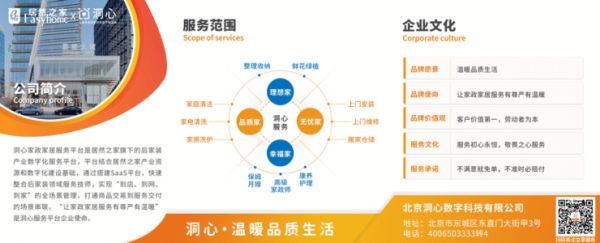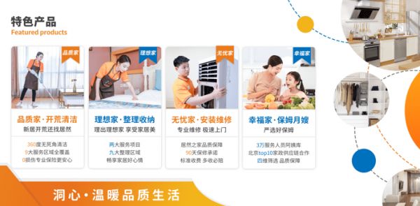 围绕消费者装修后的家居生活,洞心推出以家庭服务为中心的“品质家”、“理想家”、“幸福家”和“无忧家”四大系列产品,为消费者提供家庭清洁、整理收纳、高级家政师、保姆月嫂、婴幼看护、老人护理、安装维修、搬家运输等全方位的优质家庭服务,让客户更省心。