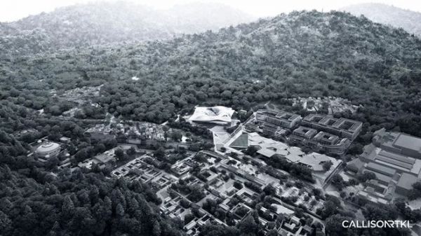 项目场地位于一片连绵起伏的山丘与复现的一组历史性宫苑景区之间,二者跨越时空相映成趣。设计从这个自然与现实的交界处获得灵感,将二元的背景转化为一个空间和隐喻性的叙述,藉以表达物理空间和虚拟存在之间不断演化的张力。