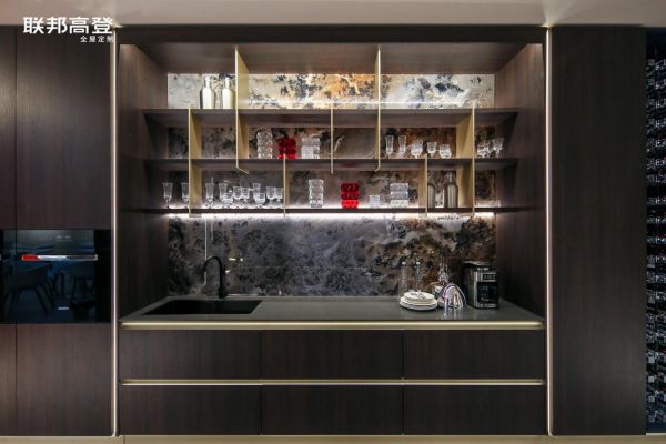 西式简餐区从功能与美学搭配出发,橱柜采用联邦高登全新花色【隐冬】精质展现,装饰陈列、备餐一步到位;实现了多元材质的共生并融,原生木皮纹理、玻璃、金属、亚克力、石材等在柔和灯光渲染下呈现奇妙质感。