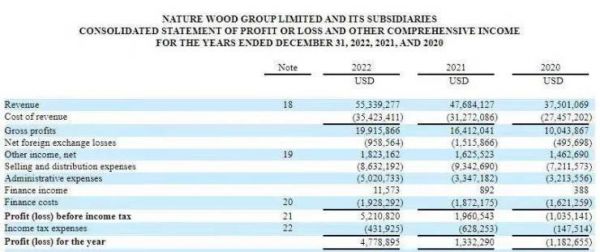 业绩方面,2020年至2022年,Nature Wood的收入分别为3750.11万、4768.41万和5533.93万美元,净利润分别为-118.27万、133.23万和477.89万美元。
