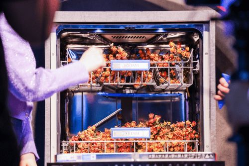 随后,主持人在崔波陪同下来到二品类、一品类和三品类展区,详细体验了老板厨电的创新功能。如在老板蒸烤炸一体机上应用的“加汽旋转烤”,不仅能让食物快速烤熟,还能烤匀。现场使用烤笼配件,烘焙咖啡豆和烤花茶,更充分体现出蒸烤炸一体机旋转烤的优势。在一品类专区,崔波向主持人介绍了油烟管理“大师”——灵犀全自动油烟机5919S。它搭载的灵犀之眼,能1秒40次探测锅温,提前精准预判油烟,在油烟未升起时就先发制烟;同时能通过烹饪温度变化和楼道风压变化双重感知判断,全自动精准控烟,全程不用动手调节烟机。对于呼声较高的洗碗机,崔波也进行了耐心详细的讲解。如三叉喷臂、40000Pa高水压、75℃高温煮洗保证强劲清洁力;105℃超高温+UV紫外模块除菌,除菌除病毒率高达99.9999%,且支持免水洗独立烘干,经过洗消一体机烘干的花朵轻轻一捏就碎掉了,烘干性能遥遥领先。