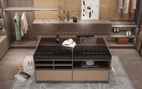 半透明玻璃衣柜和背挂式设计,既符合现代化需求,同时更能优化储物空间。用梳妆台构建岛台,增添实用功能与展陈趣味,让物品分类摆放更加清晰,既能收纳又便利寻找。