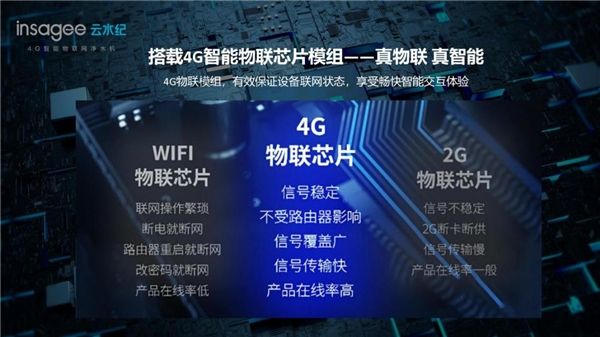 面对市面上净水器普遍存在的联网和智能功能之间的问题,云水纪创始人水哥杨东表示,对于智能净水机而言,只有能够确保设备持续联网在线,其智能功能和系统才有意义,才能发挥原本的价值。如果无法保证设备的在线率,那么所谓的“智能净水”就仅仅只是一个批着智能外衣的伪概念而已。与市面上大多数“WIFI智能净水机”、“蓝牙智能净水机”、“2G智能净水机”不同的是,云水纪4G智能物联网净水机的信号接受更稳定、数据传输效率更高、在线率也能更胜一筹,这也是云水纪宁愿付出更高的成本,也要坚持选择4G物联网芯片模组来打造4G智能物联网净水机的底层逻辑所在。