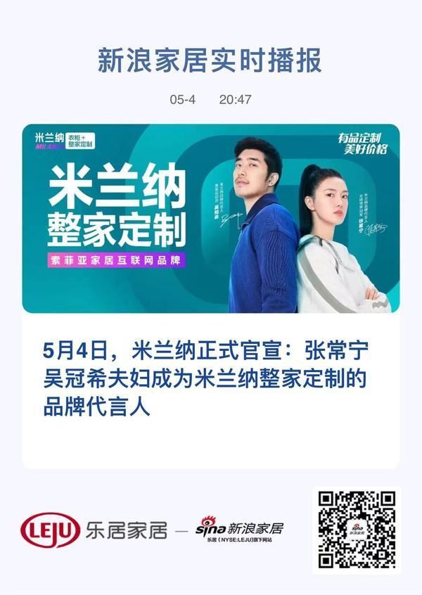 5月4日,米兰纳正式官宣:张常宁吴冠希夫妇成为米兰纳整家定制的品牌代言人。