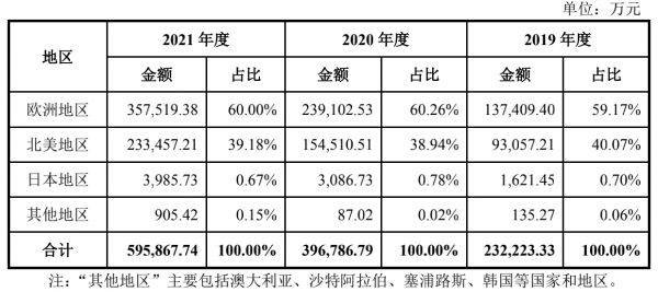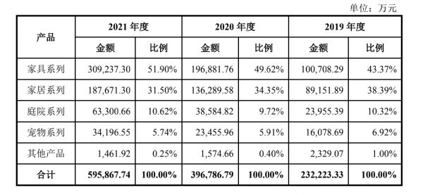 报告期内,致欧科技实现营业收入分别为232,556.63万元、397,099.27万元和596,737.95 万元,其中,以家具、家居、庭院、宠物等产品为构成的主营业务收入分别为232,223.33万元、396,786.79万元和595,867.74万元,占营业收入的比重分别为99.86%、99.92%和99.85%,占比均在99%以上,其中家具与家居系列产品占比超过80%以上,是致欧科技营业收入的主要来源。