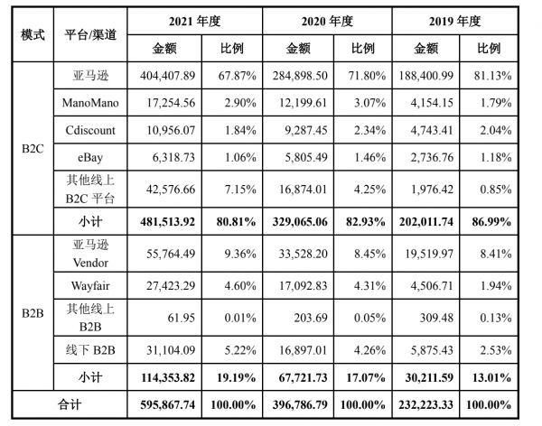 目前,致欧科技主要通过亚马逊、Cdiscount、ManoMano、eBay等海外线上B2C平台销售产品,线上B2C平台是公司的主要销售渠道。报告期内,公司线上B2C渠道实现的销售收入分别为202,011.74万元、329,065.06万元和481,513.92万元,占主营业务收入的比例分别为 86.99%、82.93%和 80.81%。目前,亚马逊、Cdiscount、ManoMano、eBay等线上平台已逐渐发展为成熟的全球性开放式电商平台。