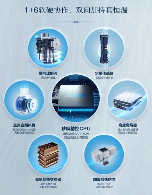 硬件上,【川】系列燃气热水器HT730搭载秒瞬精控CPU,内置全新升级的PID智能算法,可达6500万/秒超速运算,精准计算水气配比,使燃气比例阀和水量传感器快速响应,迅捷精控持久恒温。水流量传感器,可精准调节进出口水量,在CPU的配合下实现水温恒定;燃气比例阀,实时精控燃气用量,高能效稳定控温;高效燃烧器,创新增氧V型火排,增大30%燃烧面积,增强89.68%燃烧效率,削弱15%运行噪音,分段稳然技术让小火中火大火灵活调控,实现35-60℃宽幅调温。直流变频风机,最高5000r/min转速无极变速高效供氧充足。高效无氧铜热交换器,除了导热性耐腐蚀性出色,还具备更强的热冲击性能。陶瓷加热防冻,当水温低至5℃,四个陶瓷加热器便会启动加热保护,无惧国内高寒天气,-20℃也能安心热浴。1+6的软硬件协作,便可让【川】系列燃气热水器HT730输出澎湃热水,给予你舒适的沐浴体验与不间断的温暖关怀。