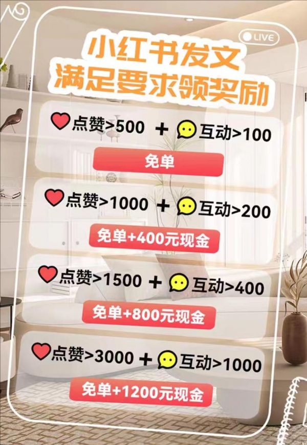 5)小红书晒图点赞量>3000+互动>1000,即可免单+1200元现金