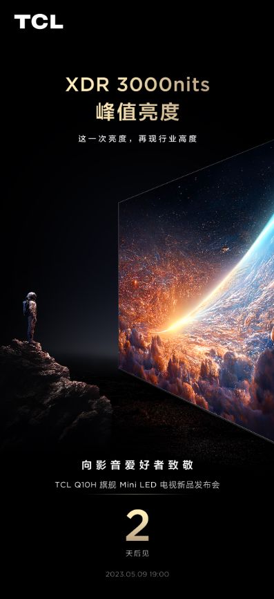 距离TCL Q10H旗舰Mini LED电视新品发布会还有两天,TCL官方也再度放出倒计时预热海报,此次预热海报主要说明的是TCL Q10H将会拥有XDR 3000nits的峰值亮度表现,这在同级别的电视产品中还是相当少见的。