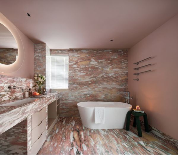 “我喜欢在卫生间喝咖啡。”柯沅伽语出惊人,但是当你看到她的卫浴间时便能完全理解。,这个以小众大理石挪威红和防水乳胶漆搭配打造的粉色独立卫浴空间,独特而不张扬、清爽又梦幻。卫生间秉持三分离功能特点,不仅貌美,还兼具实用性。超宽的洗漱台面可以安置她喜爱的各式香薰蜡烛与日常洗护用品。在独享洗浴时能喝上一杯红酒,泡澡时的阅读都让放松感油然而生。