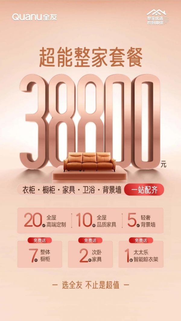 作为整家服务的先行者,全友以前瞻性布局,早在2017年起便持续推出了针对不同户型大小以及不同家居需求的16800、19800、39800等定制及整家套餐,而随着新消费需求的涌现,在原有的39800套餐基础上,全友聚焦在“质”与“量”上再次升级,重磅推出38800超能整家套餐,以绝对的品牌优势和极具吸引力的套餐配置直击消费者对于真正的一站式家居服务的消费痛点。